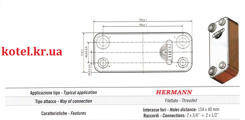 Теплообменник Hermann Thesi вторичный используется в котлах Hermann Thesi 23E, 28E, Hermann Thesi 24SE, 30SE, соответственно на турбированные и на дымоходные версии котлов теплообменники одинаковые. В зависимости от мощности котла – количество пластин на теплообменнике Hermann Thesi отличается. Котел Hermann Thesi может комплектоваться вторичными теплообменниками двух фирм производителей Giannoni и Zilmet на 18 пластин и 20 пластин. Теплообменник на горячую воду Hermann Thesi от завода Zilmet абсолютно взаимозаменяем с теплообменником ГВС Thesi фирмы Giannoni PP18FW6R02. Giannoni и Zilmet – это известные итальянские бренды, которые занимаются производством комплектующих для газового оборудования.